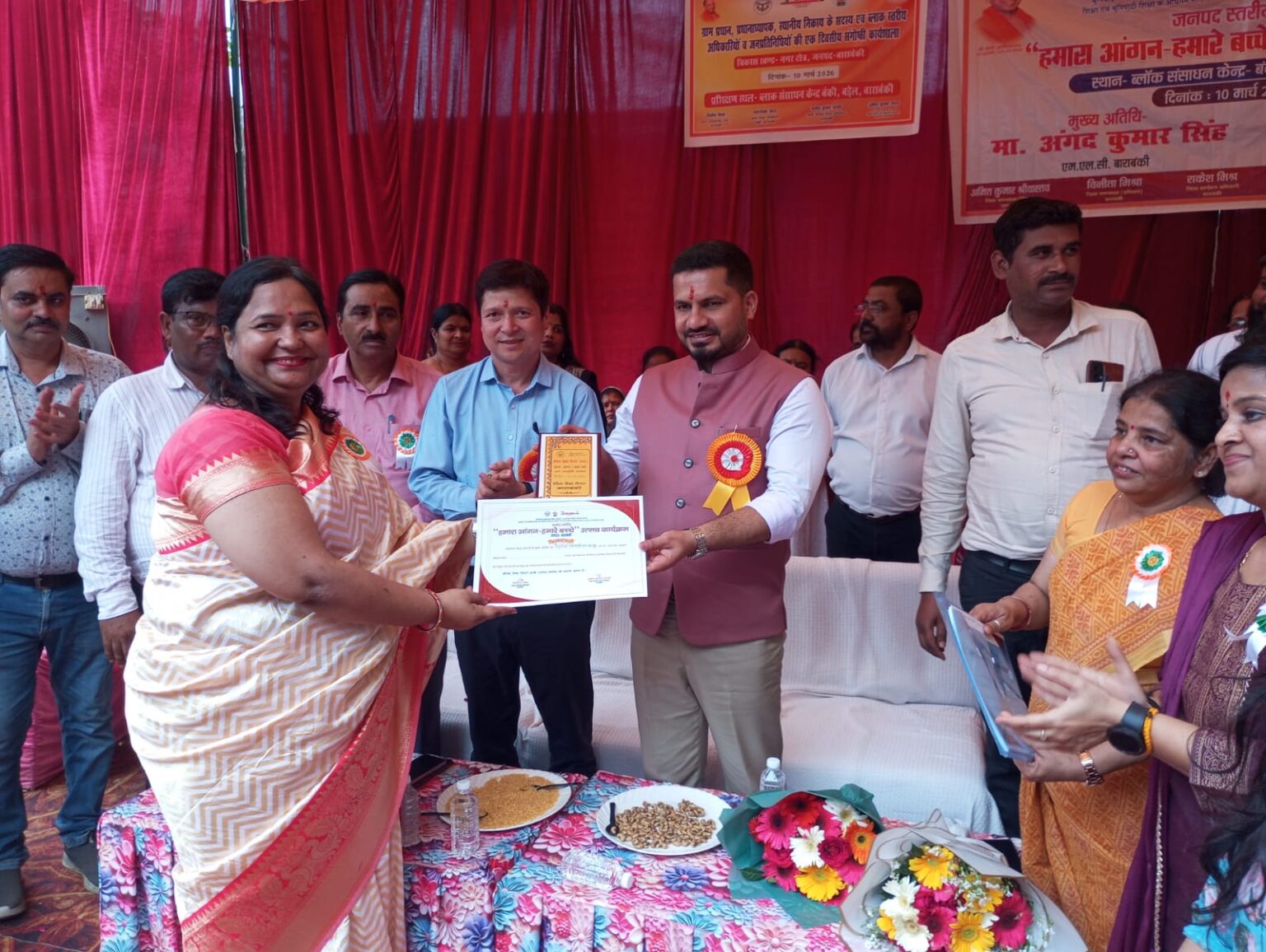 बाराबंकी। जनपद स्तरीय हमारा आंगन–हमारे बच्चे उत्सव कार्यक्रम का आयोजन ब्लॉक संसाधन केंद्र बंकी (बड़ेल) में सम्पन्न हुआ। कार्यक्रम का शुभारंभ मुख्य अतिथि सदस्य विधान परिषद अंगद कुमार सिंह ने किया। विशिष्ट अतिथि जिलाधिकारी शशांक त्रिपाठी ने कविता, कहानी एवं भाषण प्रतियोगिता में उत्कृष्ट प्रदर्शन करने वाले बच्चों को सम्मानित कर उनका उत्साहवर्धन किया। कार्यक्रम में बेसिक शिक्षा विभाग में उत्कृष्ट कार्य करने वाले 15 विकास खंडों एवं नगर क्षेत्र के नोडल शिक्षक प्री-प्राइमरी, नोडल संकुल शिक्षक, ईसीसी एजुकेटर, नोडल शिक्षामित्र, नोडल आंगनबाड़ी कार्यकर्त्री तथा आईसीडीएस मुख्य सेविकाओं को भी सम्मानित किया गया। कार्यक्रम की शुरुआत कंपोजिट विद्यालय बड़ेल के बच्चों द्वारा प्रस्तुत सरस्वती वंदना एवं स्वागत गीत से हुई। मुख्य अतिथि अंगद कुमार सिंह ने इंस्पायर अवार्ड में उत्कृष्ट प्रदर्शन करने वाले बच्चों को शुभकामनाएं देते हुए कहा कि बेसिक शिक्षकों और आंगनबाड़ी कार्यकर्त्रियों के सहयोग से ही बच्चों की मजबूत नींव तैयार होती है। उन्होंने कहा कि शिक्षक बच्चों के लिए रोल मॉडल होते हैं तथा अभिभावकों के संस्कारों का प्रभाव बच्चों के व्यक्तित्व पर पड़ता है। शिक्षक सौभाग्यशाली होता है क्योंकि वह नन्हे-मुन्ने बच्चों के भविष्य का निर्माण करता है। उन्होंने अपने छात्र जीवन के संस्मरण साझा करते हुए परिषदीय विद्यालयों में ओपन जिम की व्यवस्था किए जाने की बात कही। विशिष्ट अतिथि जिलाधिकारी शशांक त्रिपाठी ने बच्चों को संबोधित करते हुए कहा कि जनपद के परिषदीय शिक्षकों के मार्गदर्शन में बच्चों को आगे बढ़ने के बेहतर अवसर मिल रहे हैं। उन्होंने आगामी शैक्षणिक सत्र से विद्यालयों की प्रार्थना सभा में पब्लिक स्पीकिंग को बढ़ावा देने पर जोर दिया, ताकि बच्चे बिना झिझक अपने विचारों को मंच पर व्यक्त कर सकें। उन्होंने कहा कि जब किसी कार्य को जुनून के साथ किया जाता है तो सफलता अवश्य मिलती है। साथ ही ग्राम प्रधानों से विद्यालयों में कायाकल्प योजना के अंतर्गत कराए गए कार्यों को अनुकरणीय बताते हुए सहयोग जारी रखने की अपील की।